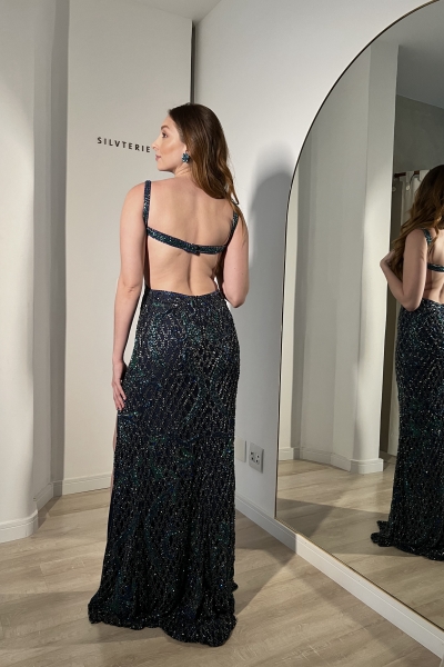 Descrição: Vestido azul com detalhes do bordado em verde, com fenda e costas nuas.
